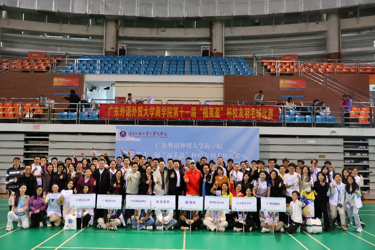 On November 23, 2024, School of Business (SoB) at Guangdong University of Foreign Studies (GDUFS) held the 11th “FTBY Cup” Alumni Badminton Tournament in the gymnasium of the University Town Campus. The event was attended by LIN Ming, Chairperson of Forewin Trading Co., Ltd. in Guangzhou and Executive Chairperson of the Alumni Association of SoB, HUANG Huinuan, General Manager of Forewin Trading Co., Ltd. in Guangzhou, YAO Shuibin, Executive Vice President of SoB Alumni Association and Chairperson of Guangzhou Zhonghai Chemical Fuel Co., Ltd., and HUANG Chaowei, Executive Secretary-General of the Alumni Association Council of SoB. More than 200 alumni formed eight teams to compete in a full day of matches. Faculty members, including XIAO Feng, Chairperson of SoB, and SHEN Changxia, Deputy Chairperson of SoB, participated throughout the event.