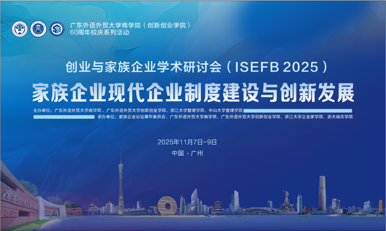 The International Symposium on Entrepreneurship and Family Business (ISEFB), founded in 2005, has successfully held twenty sessions to date. The 2025 ISEFB will be held from November 7 to 9 at Guangdong University of Foreign Studies (GDUFS). The conference is organized by School of Business (SoB) and the School of Innovation and Entrepreneurship at GDUFS, the School of Management at Zhejiang University, and School of Business at Sun Yat-sen University. It is co-hosted by the Young Scholars Committee of the Family Business Forum, SoB and the School of Innovation and Entrepreneurship at GDUFS, the School of Management at Zhejiang University and Hangzhou City University. This year, the theme of the conference is “Construction and Innovative Development of Modern Enterprise System in Family Businesses”. Leading academic journals such as Management World, Nankai Business Review, Foreign Economics & Management, Advanced Management Studies, Journal of Industrial Engineering and Engineering Management, and Journal of Digital Management are invited to participate.