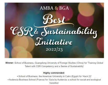 On December 9, the Association of MBAs and Business Graduates Association (AMBA & BGA) held the Excellence Awards ceremony. SoB of GDUFS won the Gold Award for Best Corporate Social Responsibility (CSR) and Sustainability Initiative, and Professor YUAN Denghua, Executive Dean of SoB, attended the online award ceremony and delivered a speech via video. This is the first time that a Chinese institution has received this honor. SoB at the American University in Cairo (Egypt) and Audencia Business School in Nantes (France) won the silver and bronze awards in this category, respectively.