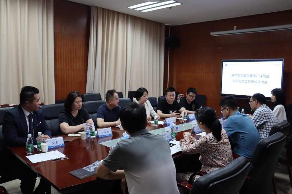 In order to thoroughly implement the spirit of General Secretary Xi Jinping’s important instructions on the employment of college graduates, and to effectively advance School of Business (SoB)’s student employment efforts and improve the quality of employment and education, on May 31, XIAO Ximing, Chairperson of SoB, SHEN Changxia, Deputy Chairperson, along with counselors LIU Fuxian, QIN Yu, and ZHANG Zhe, met with relevant leaders from Guangzhou-Shenzhen Regional Office of Atour Lifestyle Holdings Limited in the 360 conference room at the University Town Campus. They held a seminar to discuss talent development plans and explore additional employment opportunities for graduates. This seminar fostered friendly and constructive interactions between SoB and the enterprise, expanding future employment channels for SoB students and providing strong support for graduate employment initiatives.