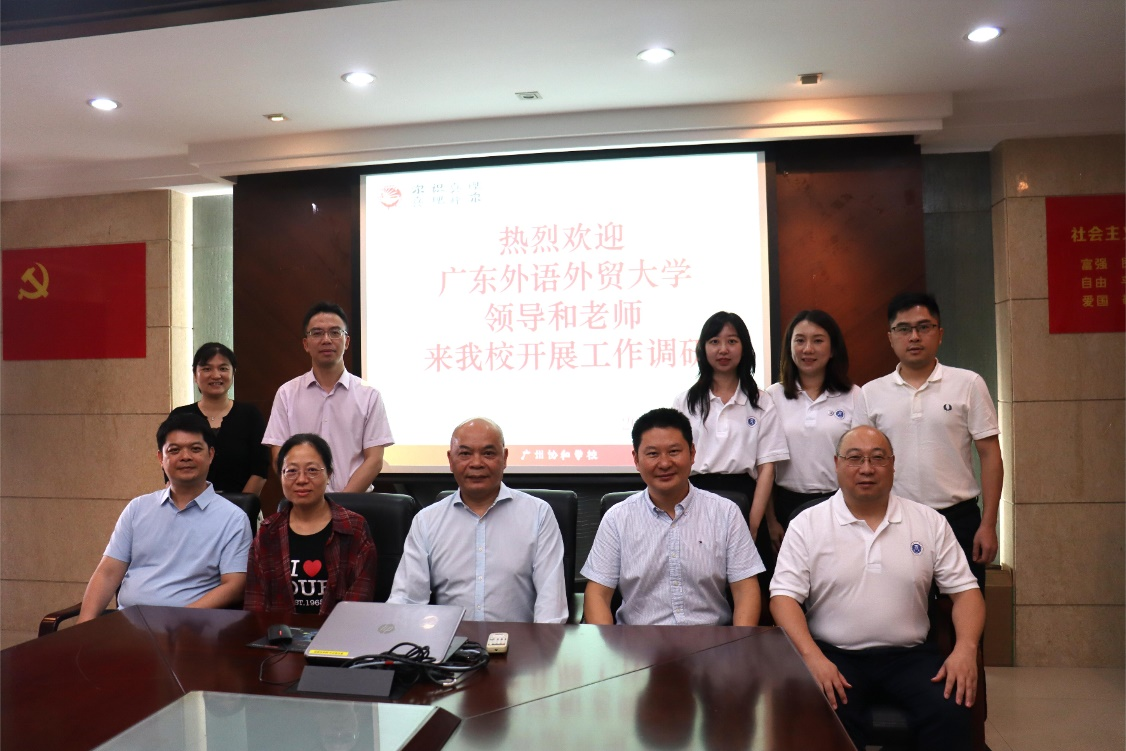 To further strengthen exchanges and cooperation between GDUFS and its high-quality student source bases in Guangzhou, and to jointly cultivate and select outstanding student resources, on May 29, a delegation from School of Business (SoB), including Chairperson XIAO Feng, Executive Dean ZENG Chuhong, Deputy Chairperson SHEN Changxia, faculty member ZHOU Yu from the Department of Business Administration, counselor HUANG Guanfu, and Secretary of Teaching Affairs LU Wenjie, visited Guangzhou Xiehe School and Guangzhou No.7 Middle School, both high-quality student source bases of GDUFS, to conduct the 2024 undergraduate admission promotion. School leaders including Party Secretaries and Vice Principals from the two high schools attended the meeting and extended a warm welcome to SoB delegation.